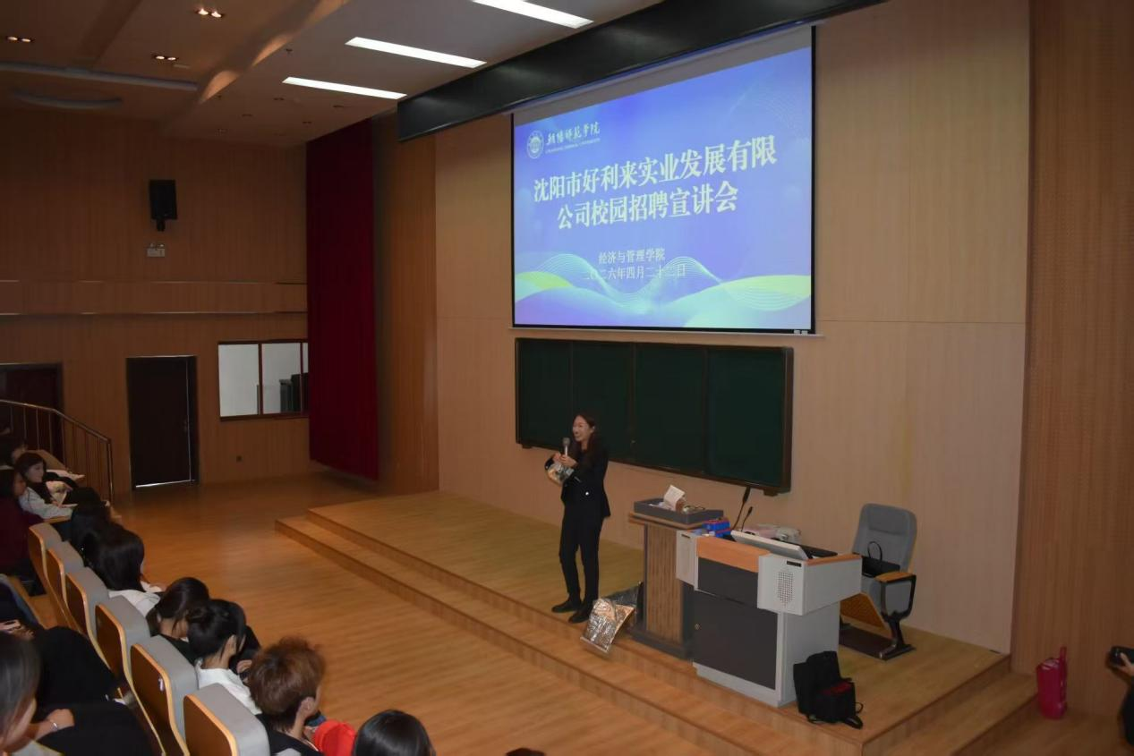 为进一步拓宽学生就业渠道,深化校企合作,帮助学生提前了解行业动态与职业发展方向,4月22日下午,经济与管理学院特别邀请沈阳市好利来实业发展有限公司开展校园招聘宣讲会。